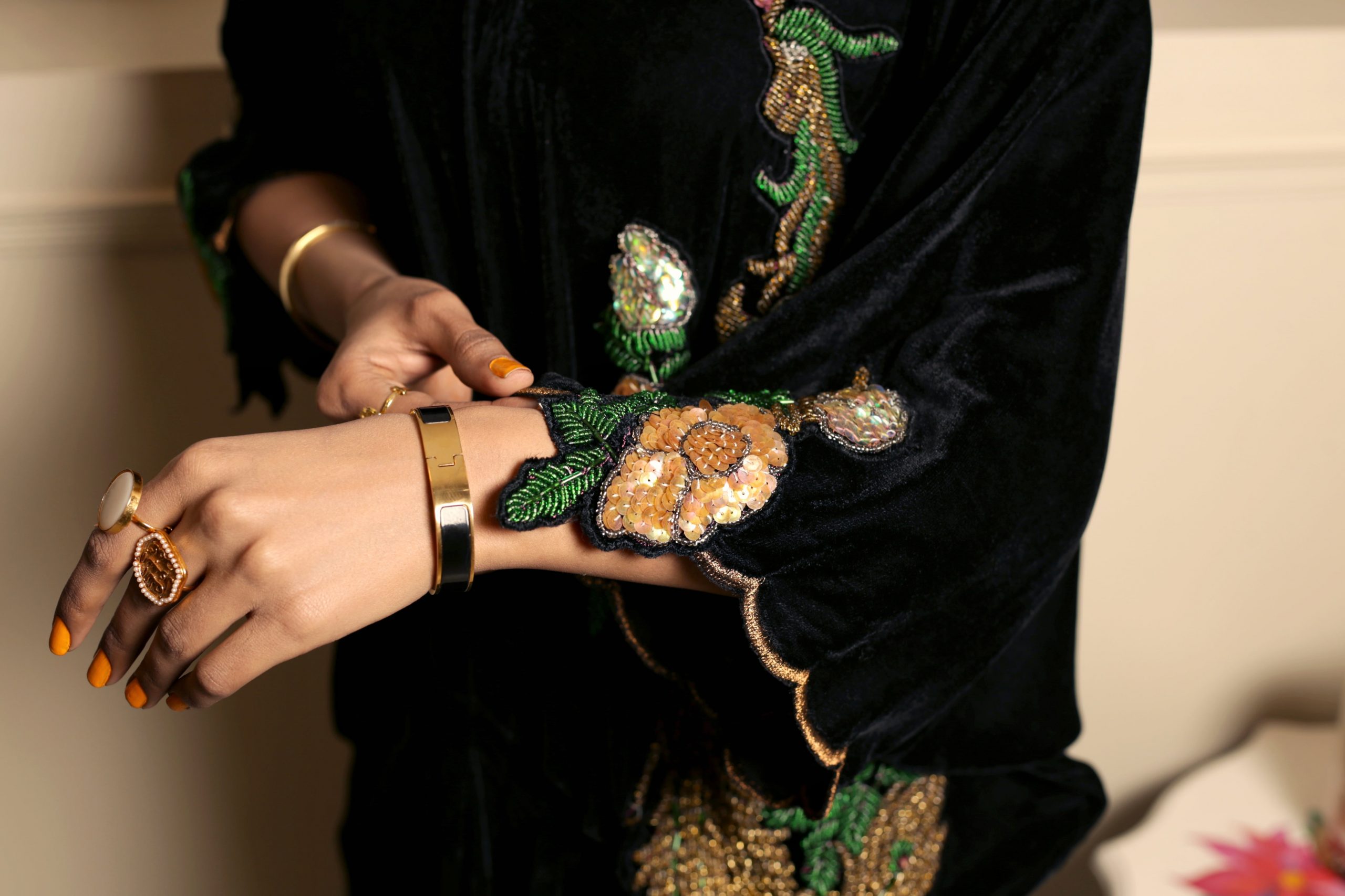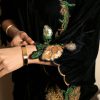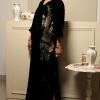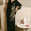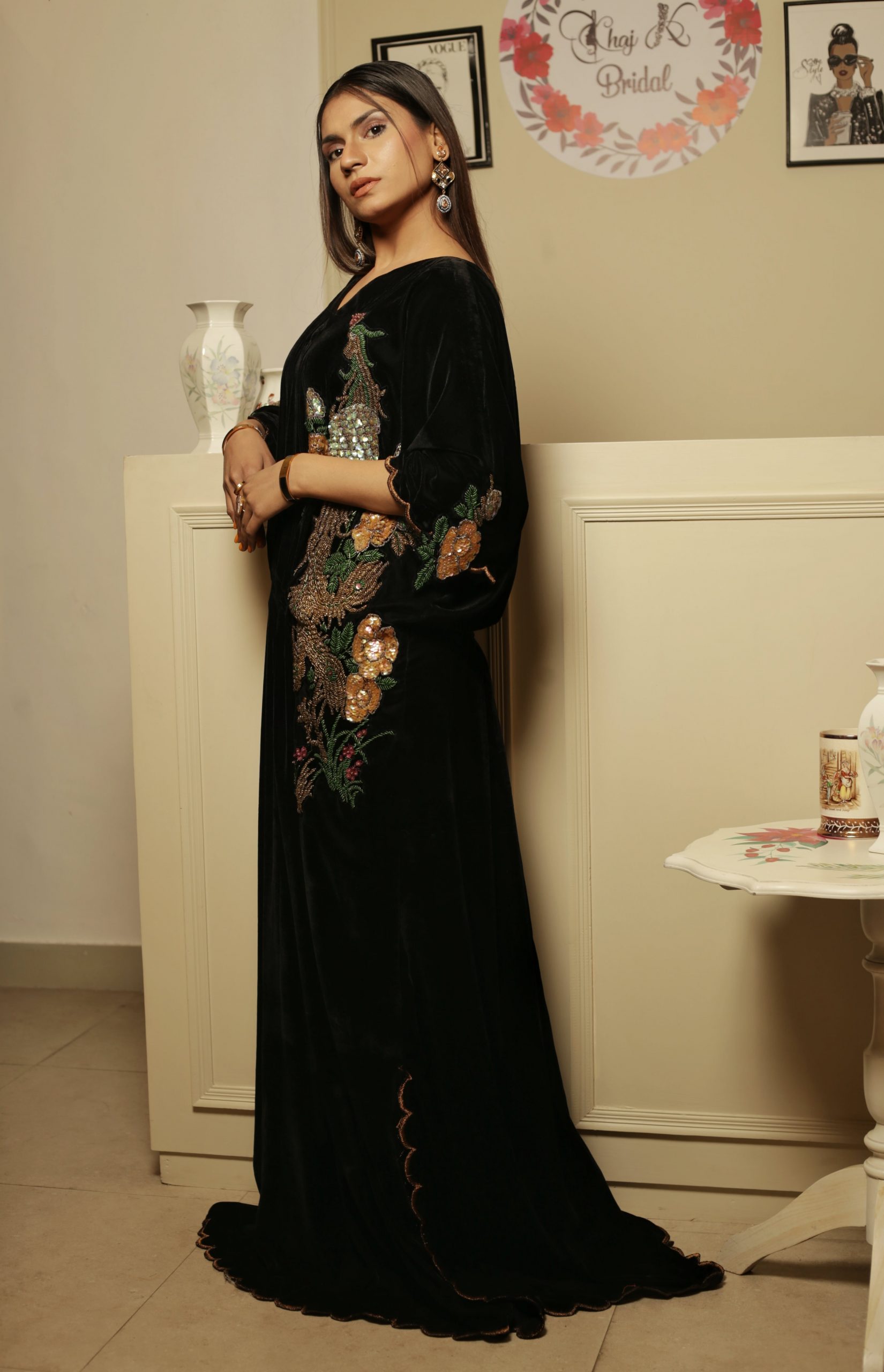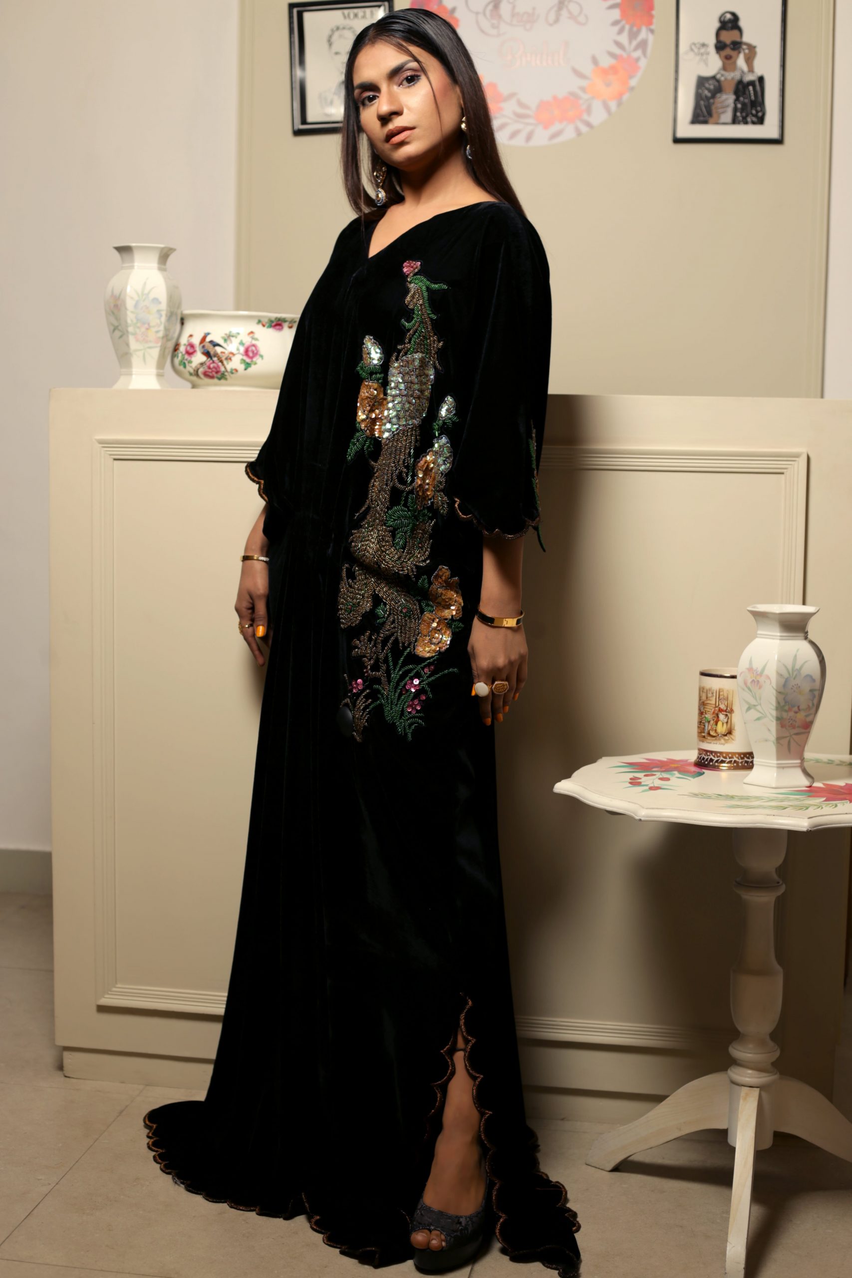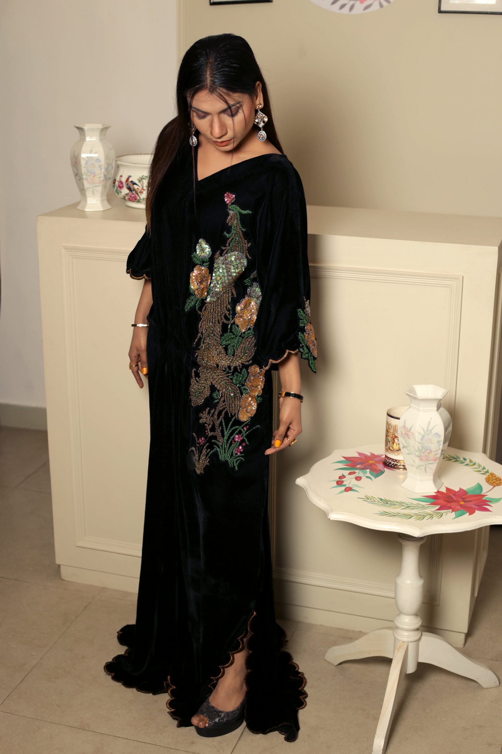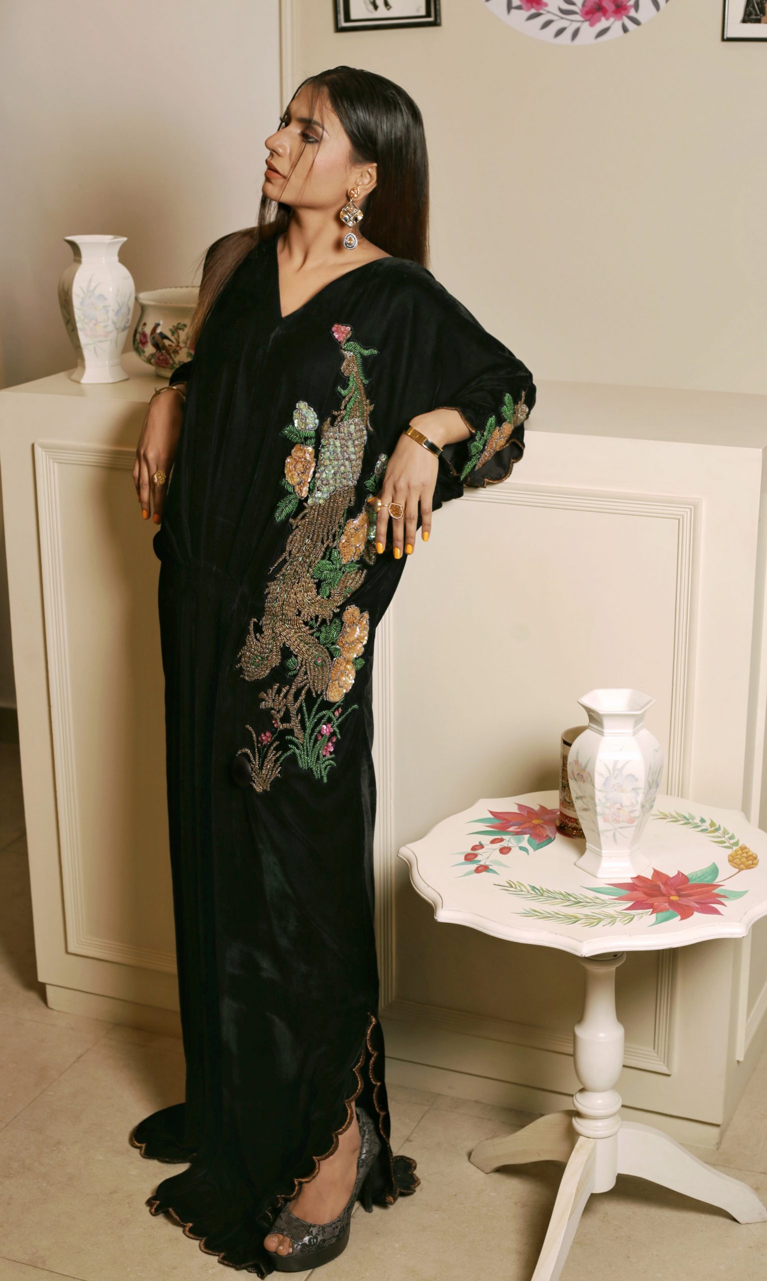 This opulent black kaftan simply exudes glamour. It is cut from plush velvet and adorned with intricately hand embroidered floral motifs on the front and back necklines. Style yours with sky high stilettos and statement earrings for a head turning look at any festivity this season!!
